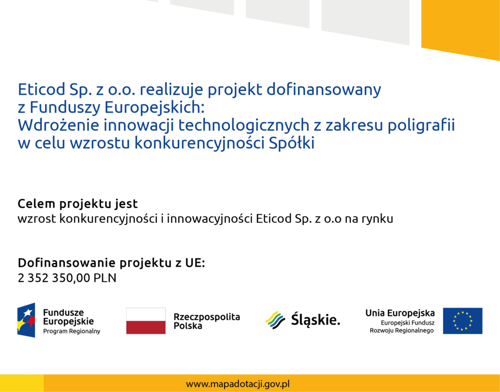 Eticod Sp. z o.o. realizuje projekt pn. „Wdrożenie innowacyjnych rozwiązań poligraficznych przez podmiot z sektora MŚP” w ramach Regionalnego Programu Operacyjnego Województwa Śląskiego na lata 2014-2020.